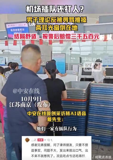 打人的时候干嘛去了?南京机场一口插队扇脸,看到赔偿款哭了 2025 年了,真没见过这么嚣张的!南京禄口机场里,大家都拖着行李排队值机,戴先生也在队伍里慢慢挪。结果突然挤过来一家四口,直接就插他前面了。戴先生一看,是一对夫妻带着俩老人,女的染着红头发还挺胖。 没等戴先生说话,红头发女人先瞪他一眼,那意思好像插队本来就该的。更气人的是,一个老人没站稳,行李箱 “哐当” 撞他箱子上,轮子还蹭到脚背,疼得戴先生直皱眉。他压着火气说 “大家都排队,这样不太好吧”,结果那女人立马炸了:“我们有老人,你年轻人等会儿怎么了?” 她老公也跟着喊:“尊老爱幼不懂啊?跟老人较什么劲!”